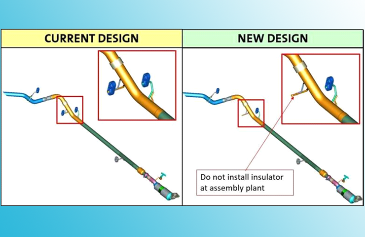 为了解决噪音问题,已不再安装排气隔离器。但机架上的排气吊架和排气管上的吊架仍在生产中。这个位置附近的排气管另一侧的排气吊架仍然连接着。(图6)这些变化于2020年6月17日在韦恩堡装配厂生效,是持续产品改进过程的一部分。西劳装配厂生产的柴油发动机和单排烟的轻型卡车还没有将隔离器从生产中移除。